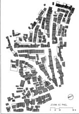 The steps are:.... 1.  Preamble1.  Define the boundary of the community 2.  Identify major points of connection to area outside 3.  Identify important views 4.  Identify special places in the land which have some soul and should be kept as important public spaces 5.  Make marks at these points. 6.  Establish a central chowk or wide public street which connects the most important existing centers 7.  Show rough lines of how other streets feed into this chowk to make a possible, rough whole